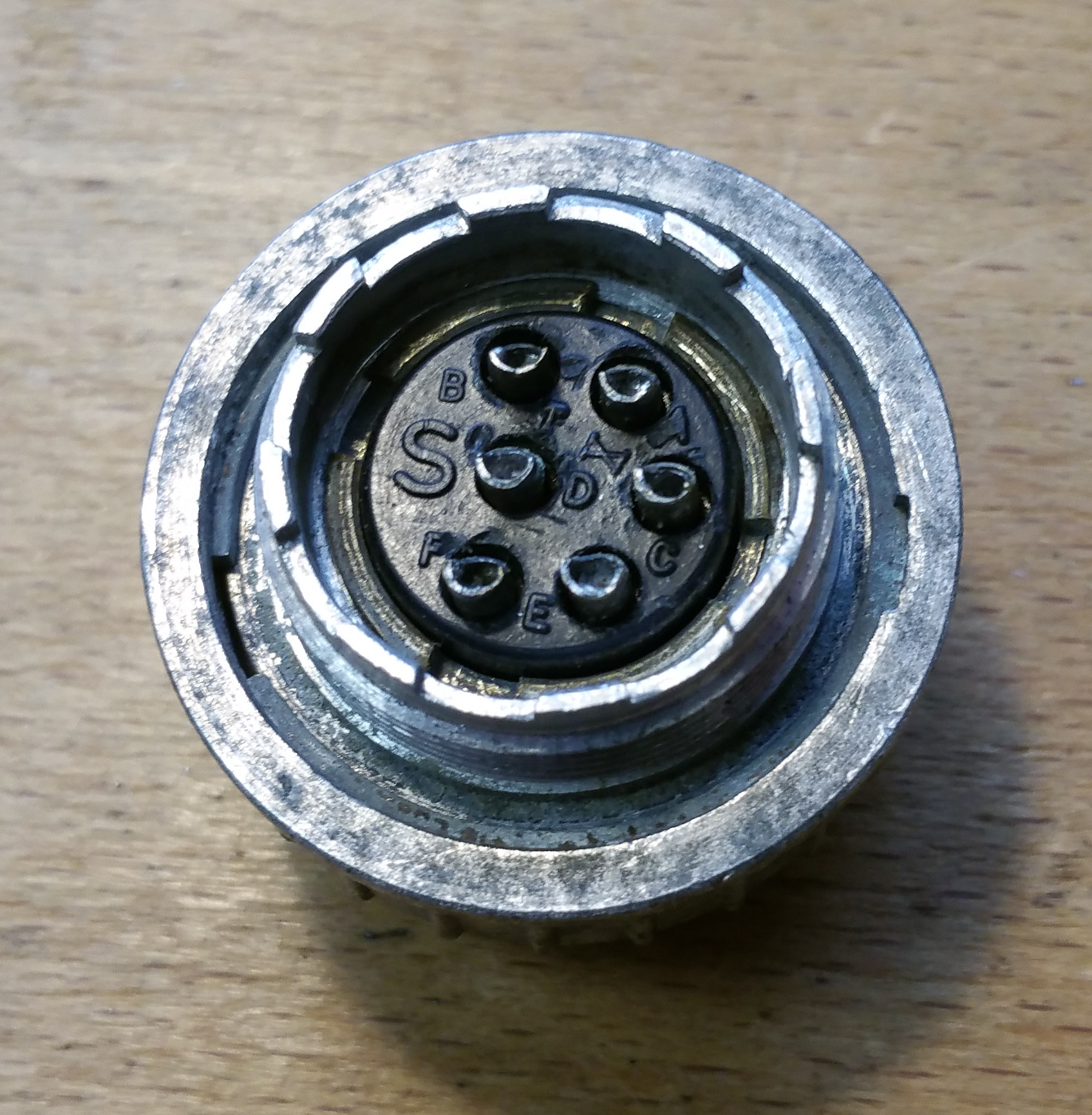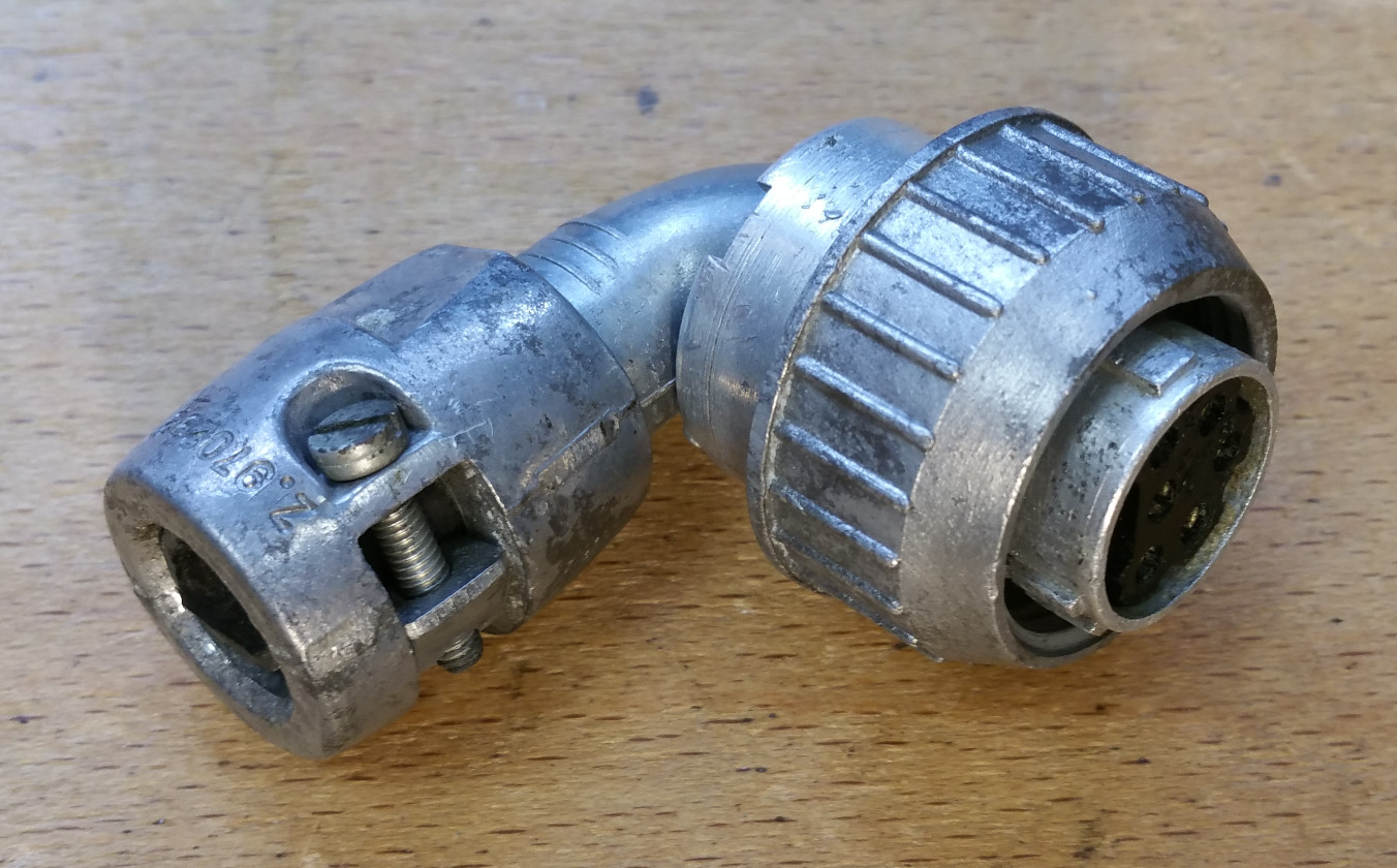 This 6 way free socket example is shown with 90° back-shell, and clamp type cable strain relief accessories, typical of the Lightning aircraft. It was badly corroded, but some light restoration has cleaned it up for simulator use.