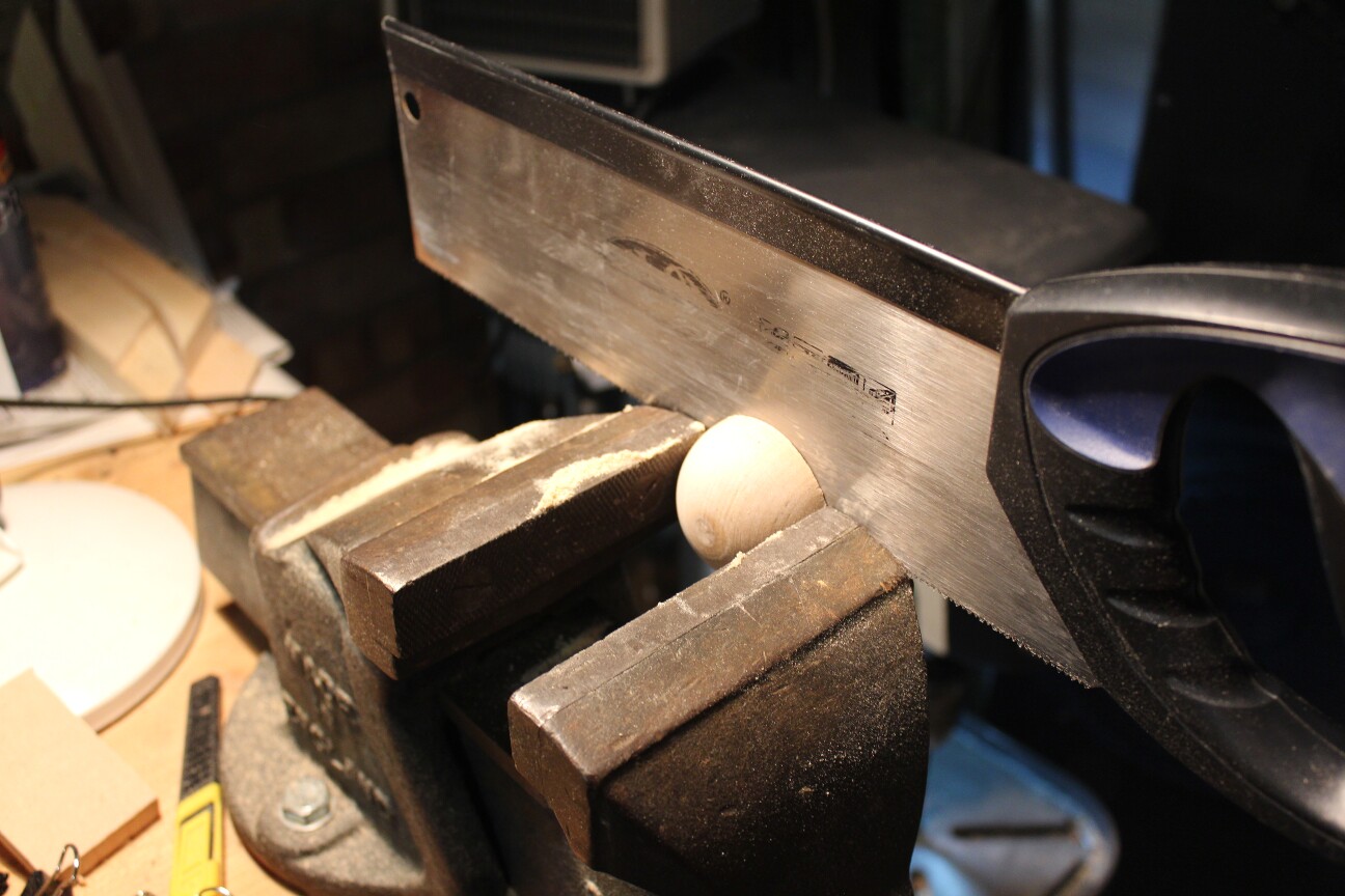 So I ended up using a spare 50mm wooden ball (same batch as the eye ball and plunger arm / gun pivots). As this will result in a hemi slightly over 50mm, when I cut the wooden ball down to make it a hemisphere, I purposefully went off centre to 48mm to make them appear slightly smaller, even though the radius was slightly over.