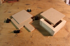I designed the size of the circular cutout in the support frame to be twice the size of the component. Luckily my cafetiere was 100mm diameter, perfect for marking out since I didn't have a pair of compasses! The support frame is held together with bulldog clips. Also note the handle integrated into the frame, this was very useful.
